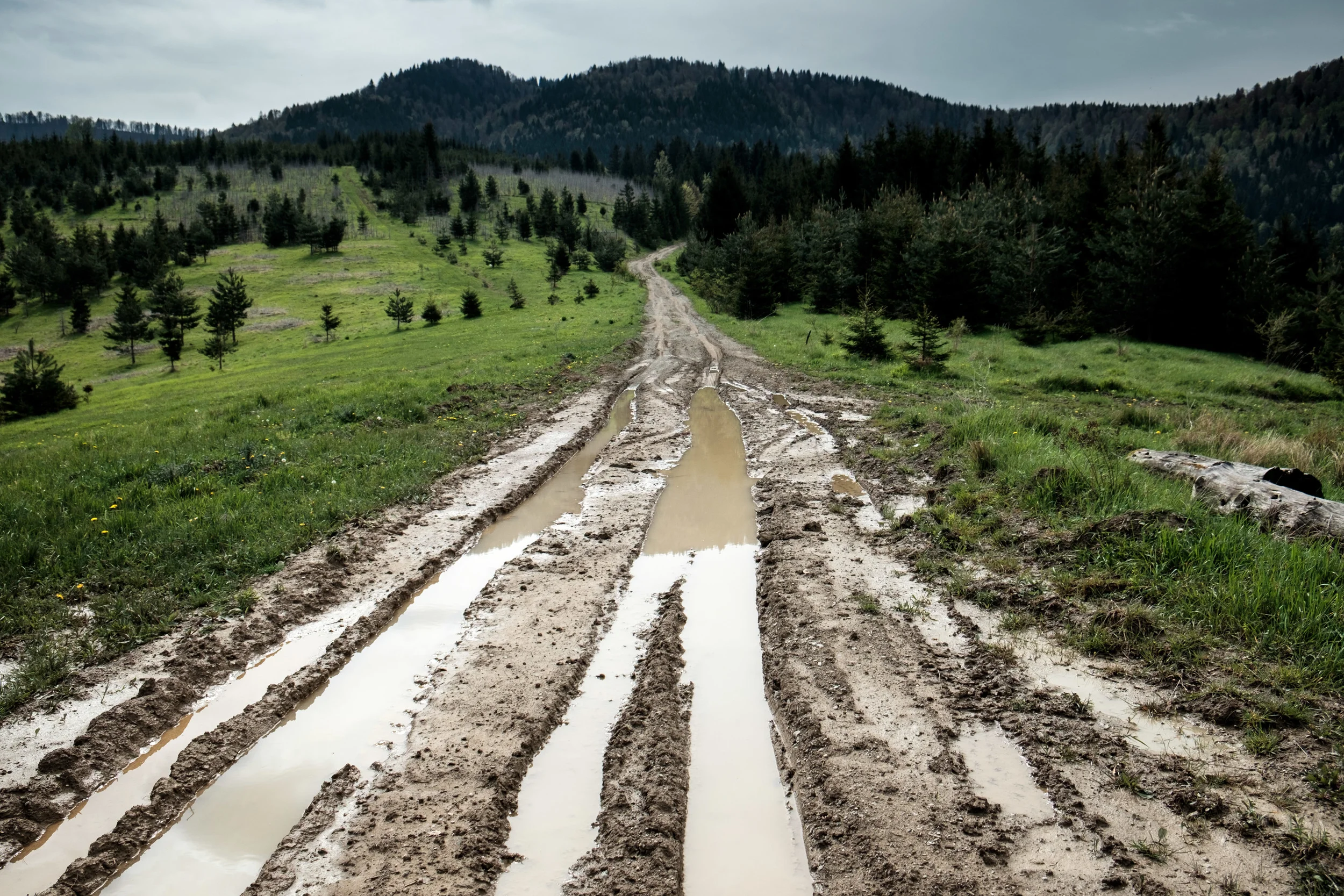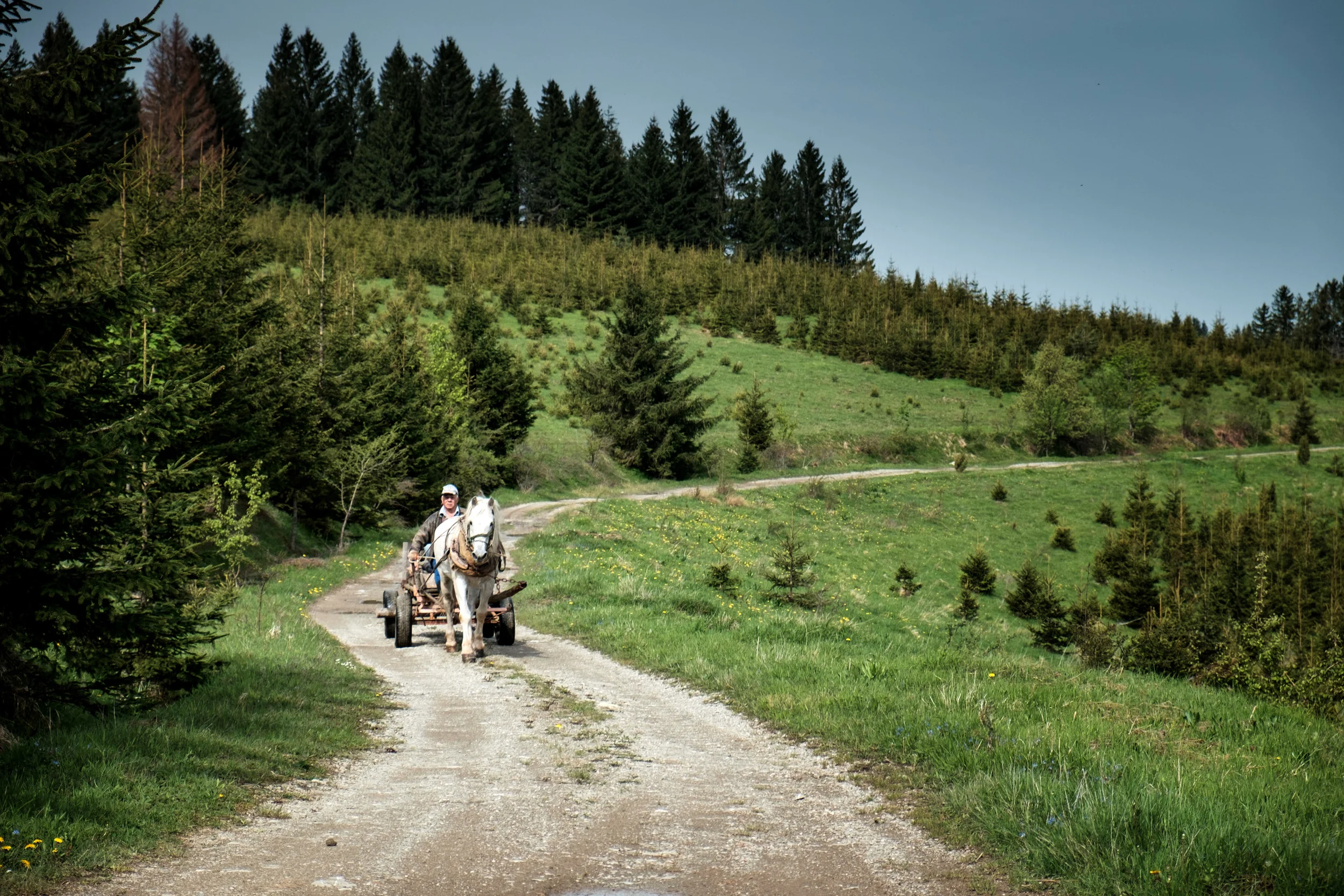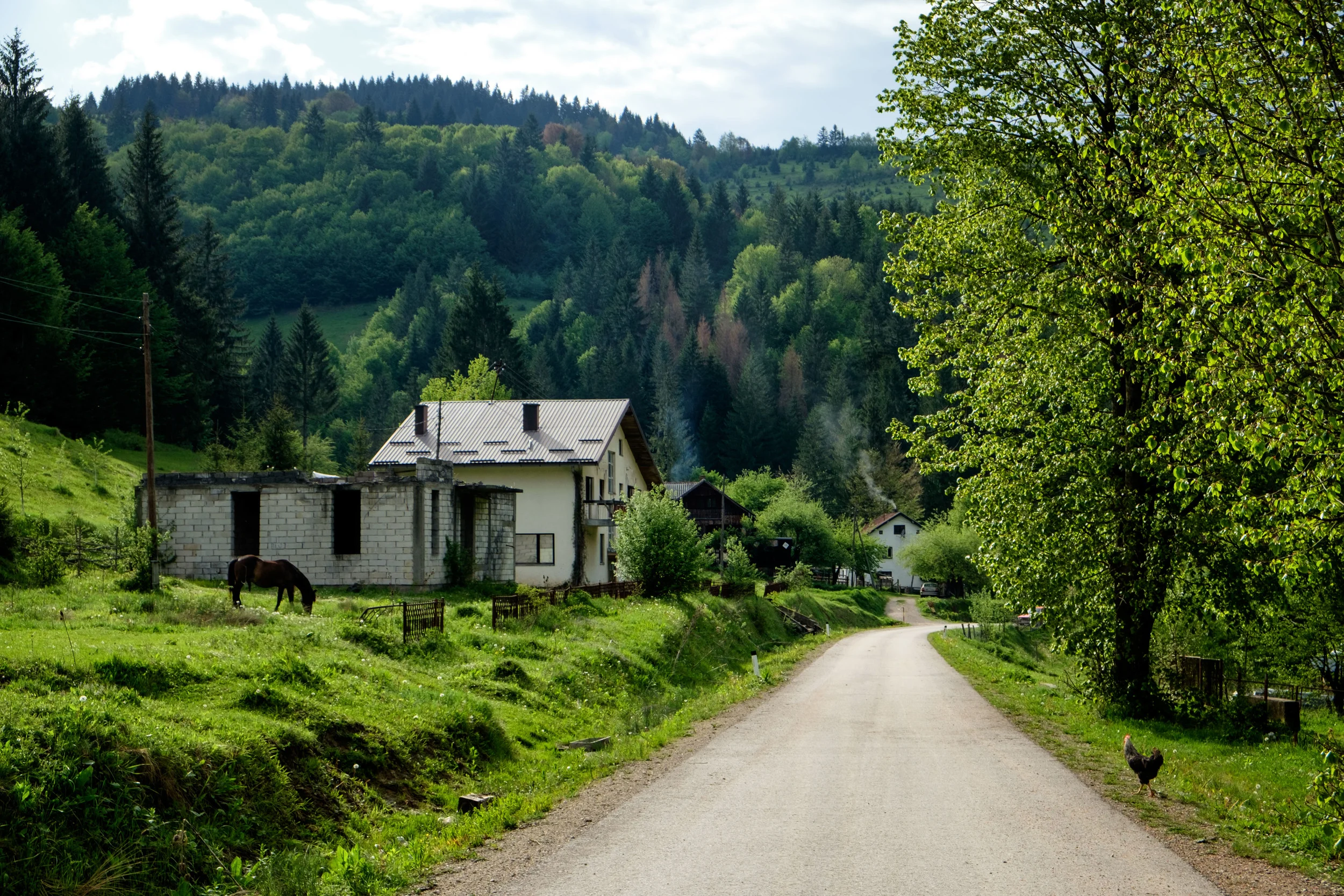 Peu après mon départ, la roche fait bientôt place à ce que j’appelle un chemin de ferme, soit de la terre battue avec des trous d'eau partout. Que dis-je de la terre battue, c'est de la boue dans laquelle mes souliers disparaissent au complet. À ce point-ci, je n'ai plus l'impression d'avancer géographiquement, j'ai l'impression de remonter le temps. Je me tourne et voit un habitant arriver en calèche... Il m'explique en 2000 mots bosniens que je ne serai pas capable de faire cette route en vélo et que je devrais revenir sur mes pas.
