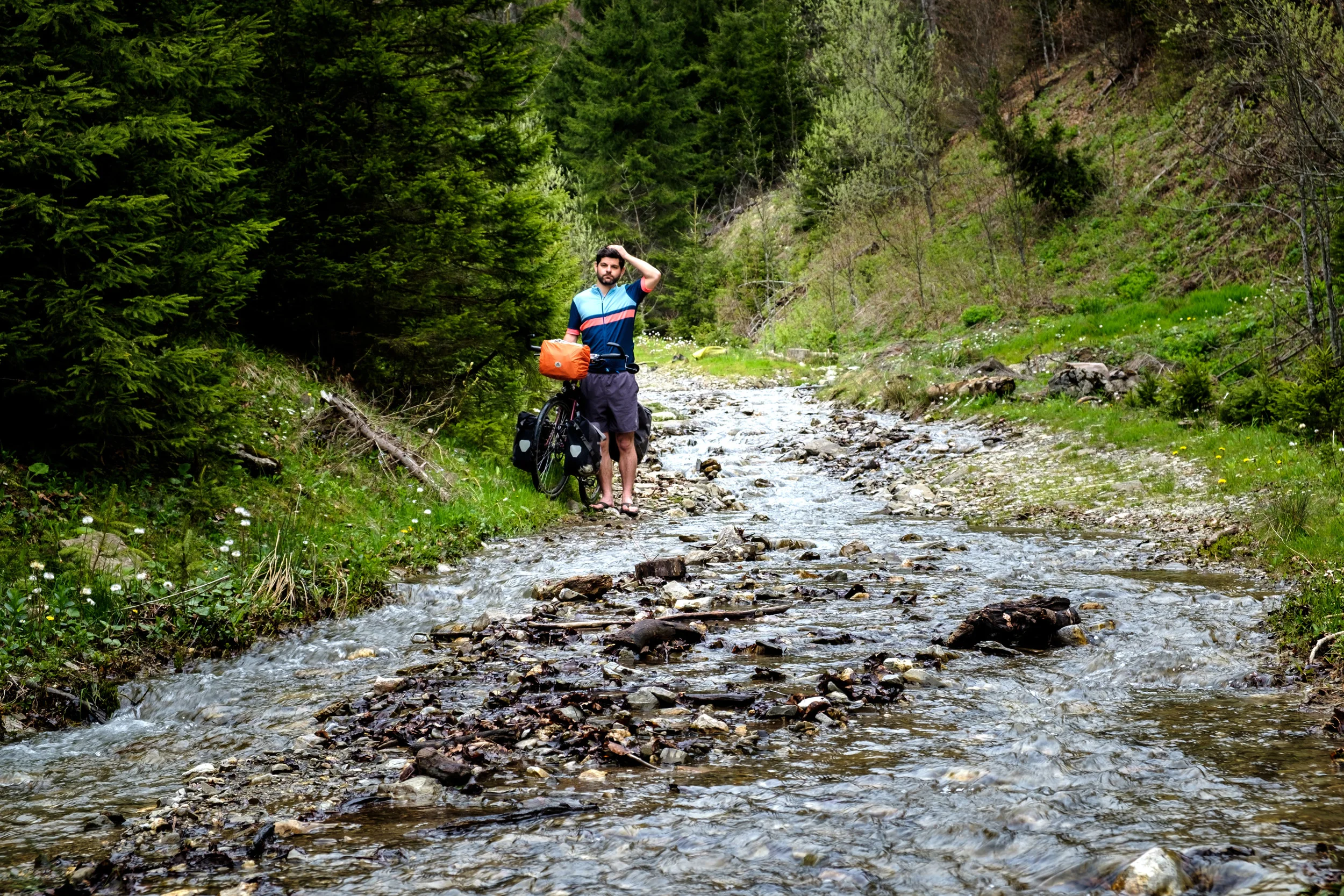 La plupart de cette nouvelle rivière n'est pas trop creuse et ne ne poserait pas problème si j'étais juste à pied. Mais le courant est très fort, les roches instables, et je n'ai pas envie de m'y aventurer avec mon vélo pour que tout mon électronique et mes vêtements se retrouvent à la flotte. Je constate que le meilleur moyen de passer est de mettre mes gougounes et de faire du portage avec mon vélo. Après cette rivière, le chemin s'améliore. Ça m'aura pris six heures faire douze kilomètres. Éternel optimiste, je me dis qu'au moins il ne pleut pas.