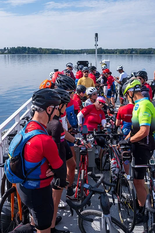 Le peloton au complet embarque sur le traversier vers Hudson, de l’autre côté de la rivière des Outaouais.